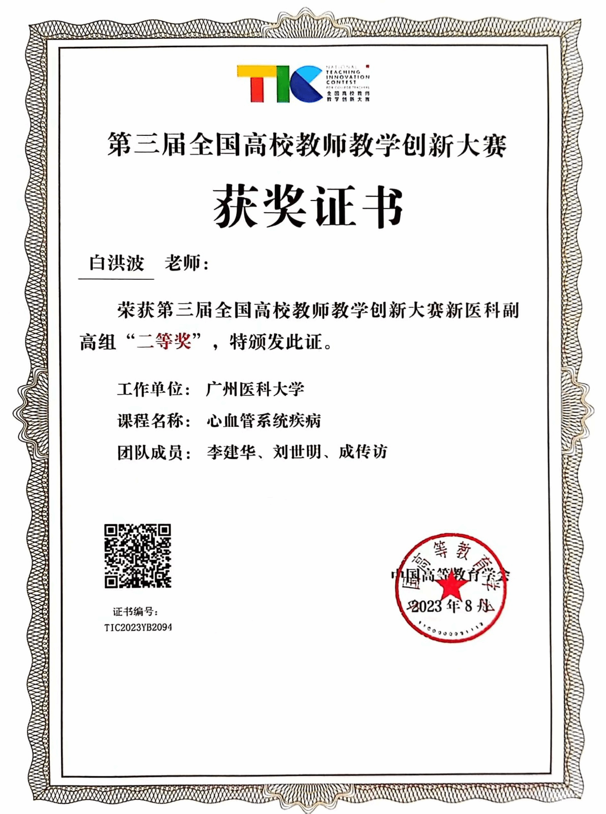 8月22日,由教育部高等教育司指导、中国高等教育学会主办的第三届全国高校教师教学创新大赛在浙江大学落下帷幕,我校基础医学院白洪波副教授《心血管系统疾病》整合课程团队荣获新医科副高组二等奖,再创我校教师在国家级高水平教学竞赛中的更佳成绩。