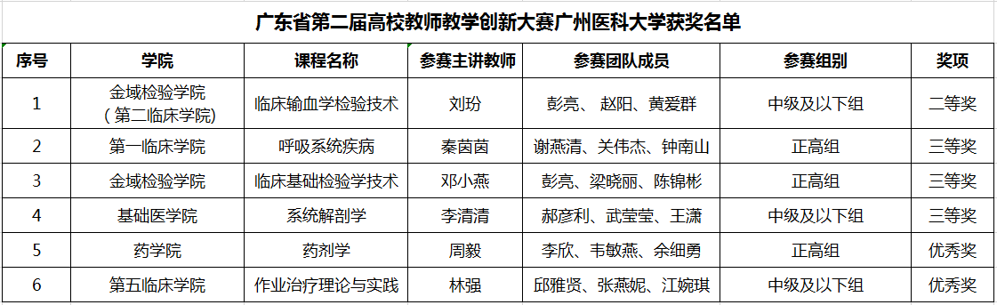 近期,由广东省教育厅指导、广东省高等教育学会和深圳大学联合主办的第二届全国高校教师教学创新大赛广东分赛暨广东省高校教师教学创新大赛获奖名单正式公布(以下简称省赛)。经过学校初赛推荐、省赛网络评审和省赛现场决赛三个阶段的激烈角逐,我校金域检验学院(第二临床学院)刘玢老师团队荣获中级及以下组二等奖;第一临床学院秦茵茵教授团队,金域检验学院邓小燕教授、基础医学院李清清老师团队分别荣获正高组、中级及以下组三等奖;药学院周毅教授团队和第五临床学院林强老师团队分别荣获正高组和中级及以下组优秀奖;同时,我校获颁优秀组织奖。