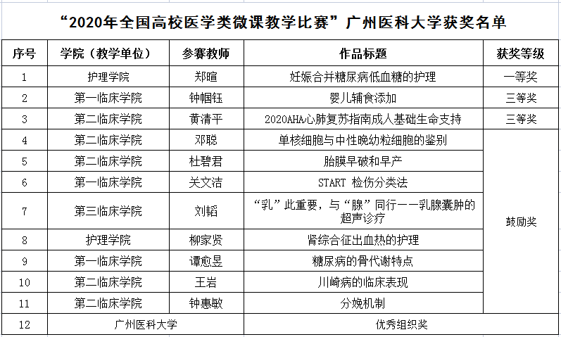 由教育部主管的《高校医学教学研究(电子版)》杂志公布了2020年全国高校(医学类)微课教学比赛结果,我校在该项比赛中喜获一等奖1项、三等奖2项、鼓励奖8项,学校再次获得该项赛事“优秀组织奖”。