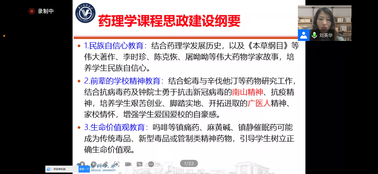 随后,刘英华副教授就“如何在课堂有机融入思政案例---以药理学课程为例”进行了讲座分享。刘教授结合自身实际,围绕“课程思政融入方式浅谈”“药理学课程思政建设纲要”“药理学课程思政举例:ACEI类药物、麻黄碱”,从课程建设及课堂教学角度深入浅出讲述了课程思政的实际开展,实践路径全面具体可行,不仅对各教师如何开展课程思政提供了借鉴,对课程建设也具有较好的启发意义。