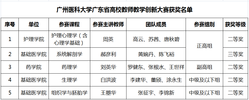 近日,由广东省教育厅指导、广东省高等教育学会和华南师范大学共同举办的首届全国高校教师教学创新大赛广东分赛暨广东省高校教师教学创新大赛获奖名单正式公布(以下简称“省赛”)。我校教师教学发展中心和省赛参赛选手全程参与现场决赛,4月9日参与现场决赛启动仪式,在4月10-11日为期两天紧张激烈的现场决赛,我校护理学院周英教授团队,药学院刘英华副教授团队,基础医学院白洪波老师团队、王曌华老师团队,分别荣获本次大赛正高组、副高组、中级以下组二等奖,基础医学院郝彦利教授团队获正高组三等奖。4月12日,省赛闭幕式暨总结表彰大会在华南师范大学圆满落幕。