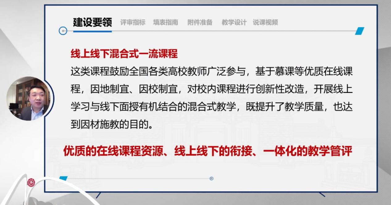 本次培训班邀请上海交通大学余建波教授担任主讲人,培训内容包括线下一流课程建设要领及标准解读和线上线下混合式一流课程建设要领及评审标准。余教授结合自身多年从事课程建设经验,通过多个案例,对一流本科课程建设应用及申报分别从政策解读、申报书、附件材料、说课视频、评审标准等方面逐项进行了深入、系统的讲解,对申报过程中普遍存在的问题给予明确解答,为我校一流本科课程建设和申报国家级一流课程提供了有力指导和宝贵意见。