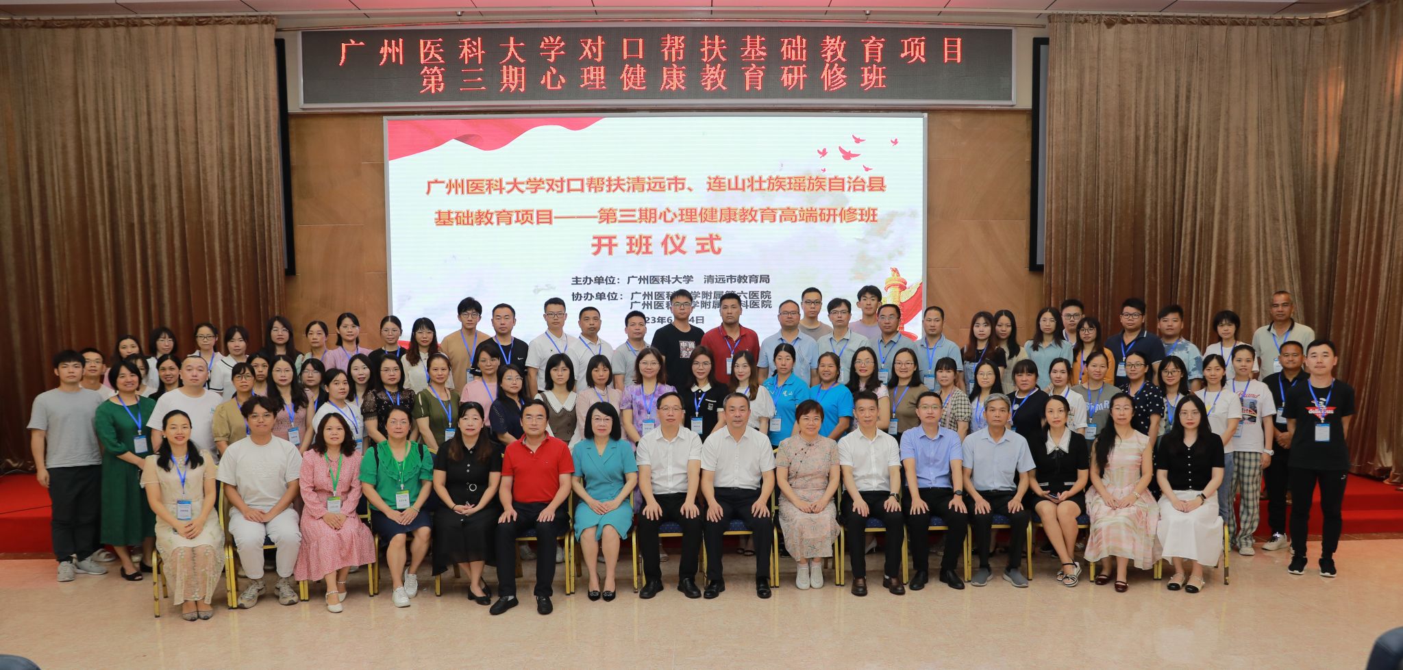 6月14-16日,广州医科大学对口帮扶清远市、连山壮族瑶族自治县基础教育项目——第三期心理健康教育高端研修班在广州医科大学附属第六医院正式落幕。来自清远市各中小学60名心理健康教育工作负责人、附属第六医院15名教师参加了本次研修。
