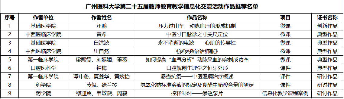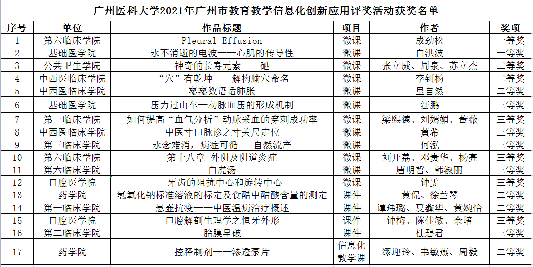 第二十五届全国教师教育教学信息化交流活动从2021年3月正式启动,我校教师教学发展中心认真组织落实,根据2021年广州市教育教学创新应用评奖活动和我校2021年微课竞赛评审结果确定推荐参评作品,共推荐10件优秀作品参加本次全国交流活动,在三个参赛项目中荣获创新作品1件,典型作品5件,研讨作品3件的佳绩。这是我校第一次在全国教师教育教学信息化交流活动中荣获创新作品。
