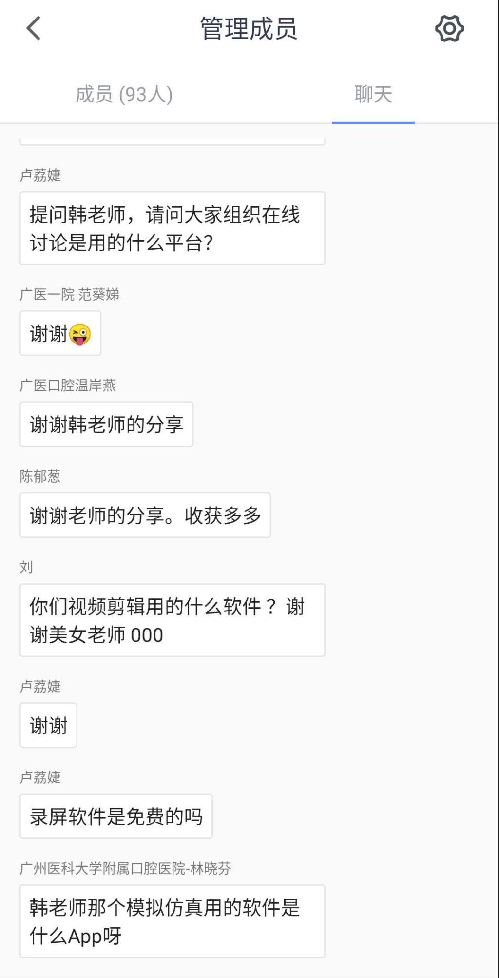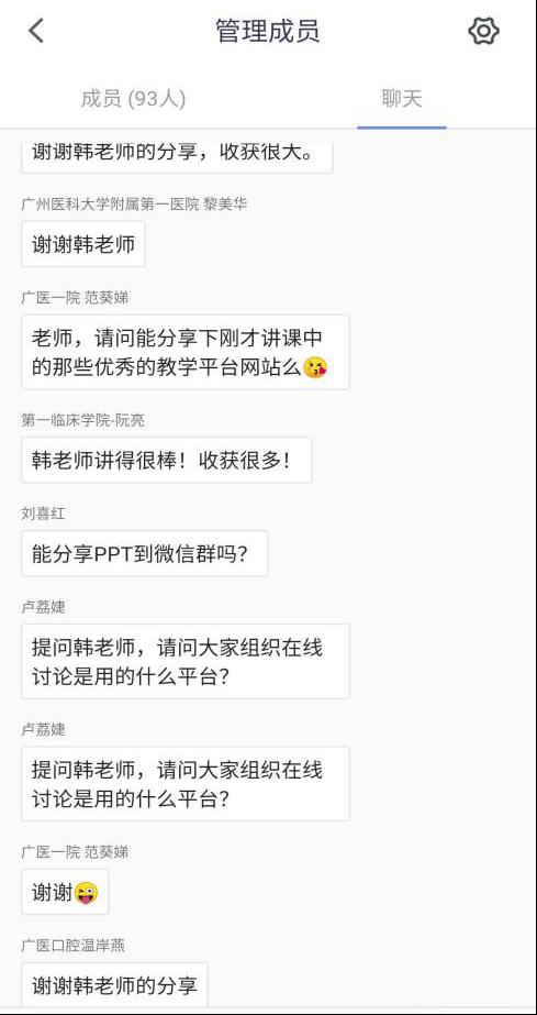 经验分享结束后,参与的老师们在聊天区进行即时互动交流,就组织在线讨论平台、虚拟仿真平台使用、线上资源建设等问题提出自己的疑惑,韩老师一一地耐心解答,同时鼓励大家多尝试使用各种录制视频的软件、视频编辑软件等,用学习创新的心态开展线上课程的建设,这个特殊时期建设的课程,日后也可以作为线下教学的补充,或用于翻转课堂,为建设线上“金课”做准备。许多老师都表示听完韩老师的分享之后收获满满,对线上实践课程资源建设有极大的启发。