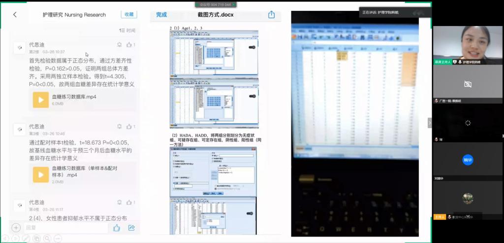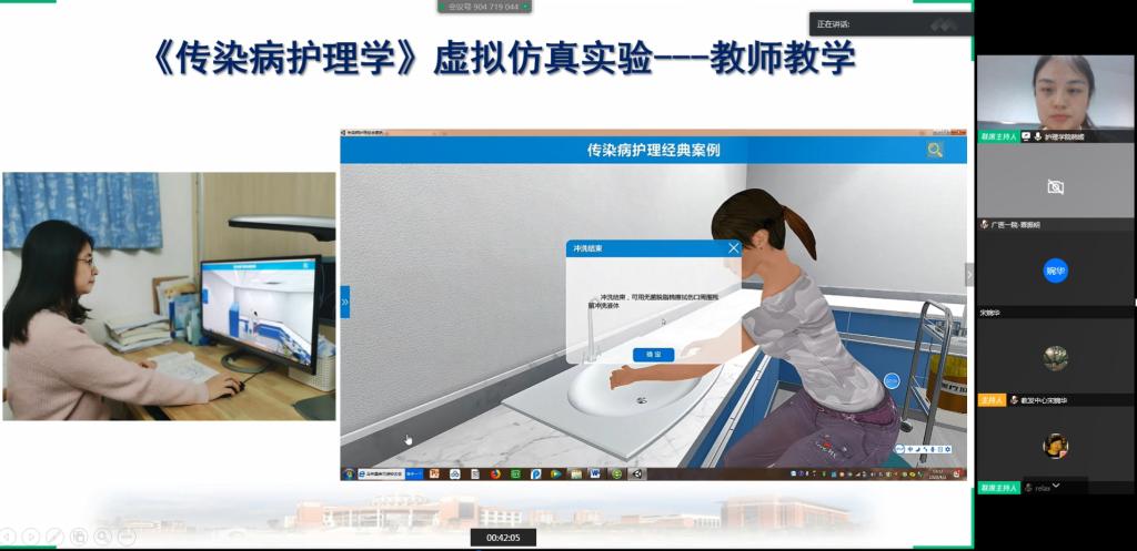 韩老师展示了护理学院积极利用护理学类虚拟仿真实验项目,进行线上实验操作,培养学生临床思维与实践能力;与临床学院紧密合作,多途径培养护理学院学生临床思维和解决复杂问题的实践能力;通过调查问卷做好学情分析,紧贴专业特点,开展线上讨论课、见习课、实习与毕业论文、护士执业资格考试在线备考,逐步培养学生科研思维及实践能力。