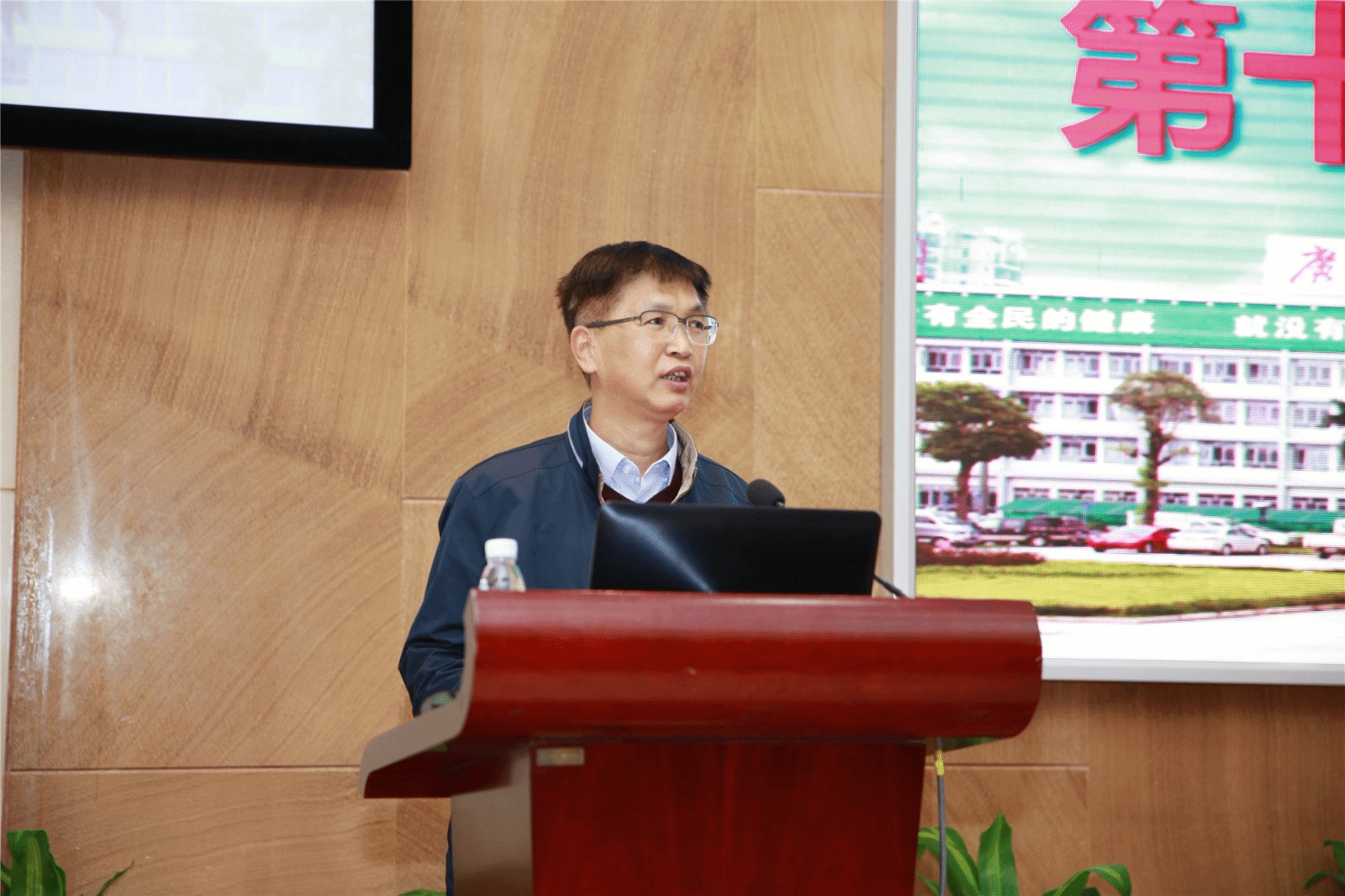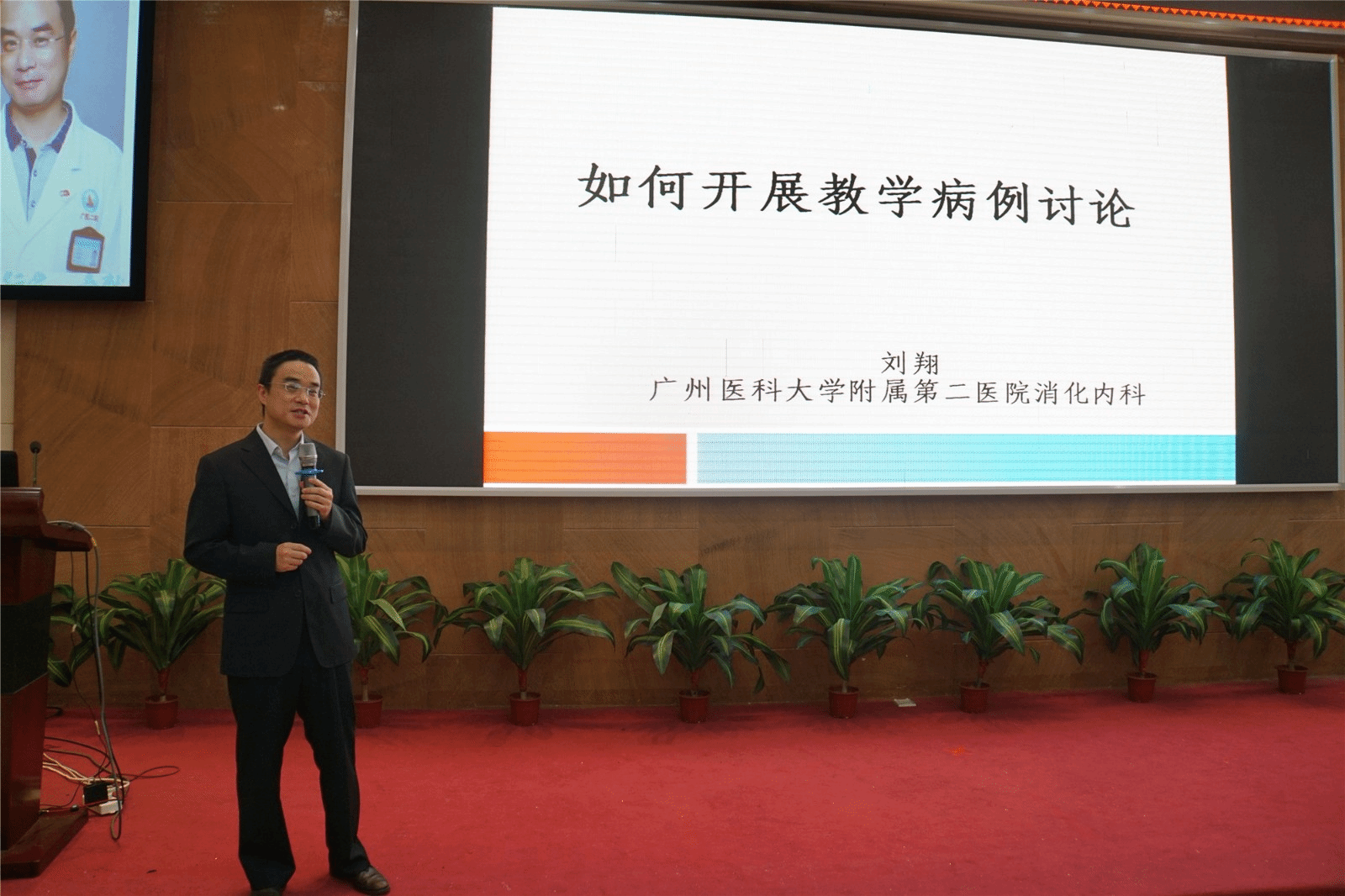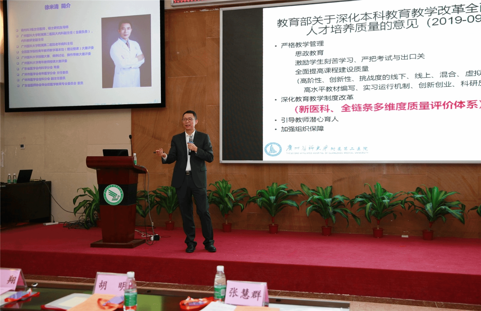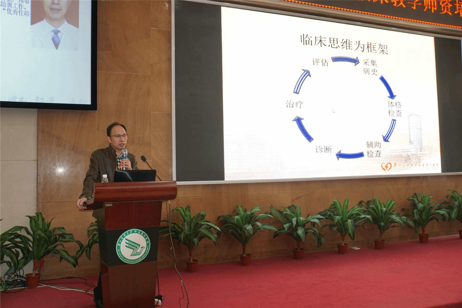 第六临床学院潘桂常主任致欢迎辞。他首先对学员的到来表示欢迎,并介绍了第六临床学院近年来在教学工作中取得的进步与发展,分享了教学对医疗与科研的促进心得,最后他希望在座老师在为期两天的培训中能学有所成,不断加强教学基本功,努力提高教育教学水平。