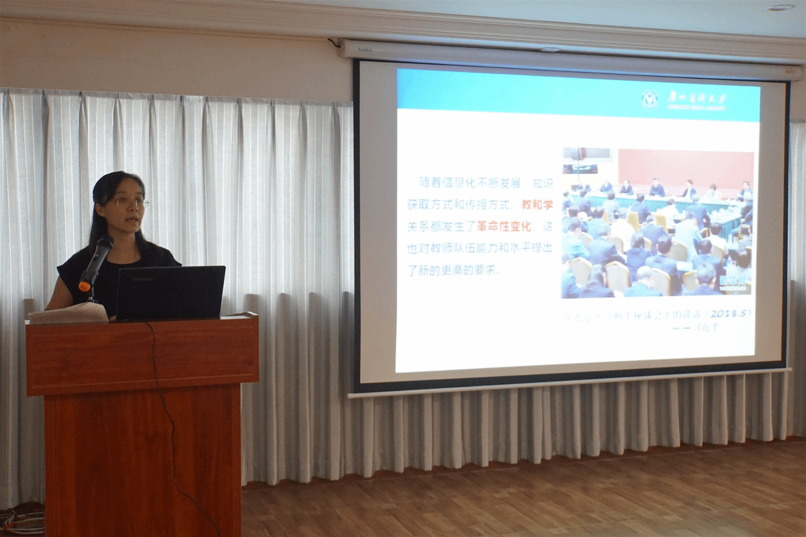本次讲座邀请了教务处张慧群副处长做主题为“建设混合式‘金课’打造一流课堂”的专题讲座。张慧群副处长在讲座中,从国家对本科教学提出的要求、课程建设的背景、“金课”和“水课”的定义、如何建设“金课”等个方面讲述打造一流课堂的重要性及如何打造一流课堂。其中张处长着重提出建设“金课”要重点围绕机制保障、引建结合、转换思维、创新授课、以评促学等方式来开展本科教学工作。最后,张慧群副处长鼓励在座教师通过学校引进的超星学习平台积极参与线上课程建设,推动我校开展精品在线开放课程的建设及混合式教学改革与实践。