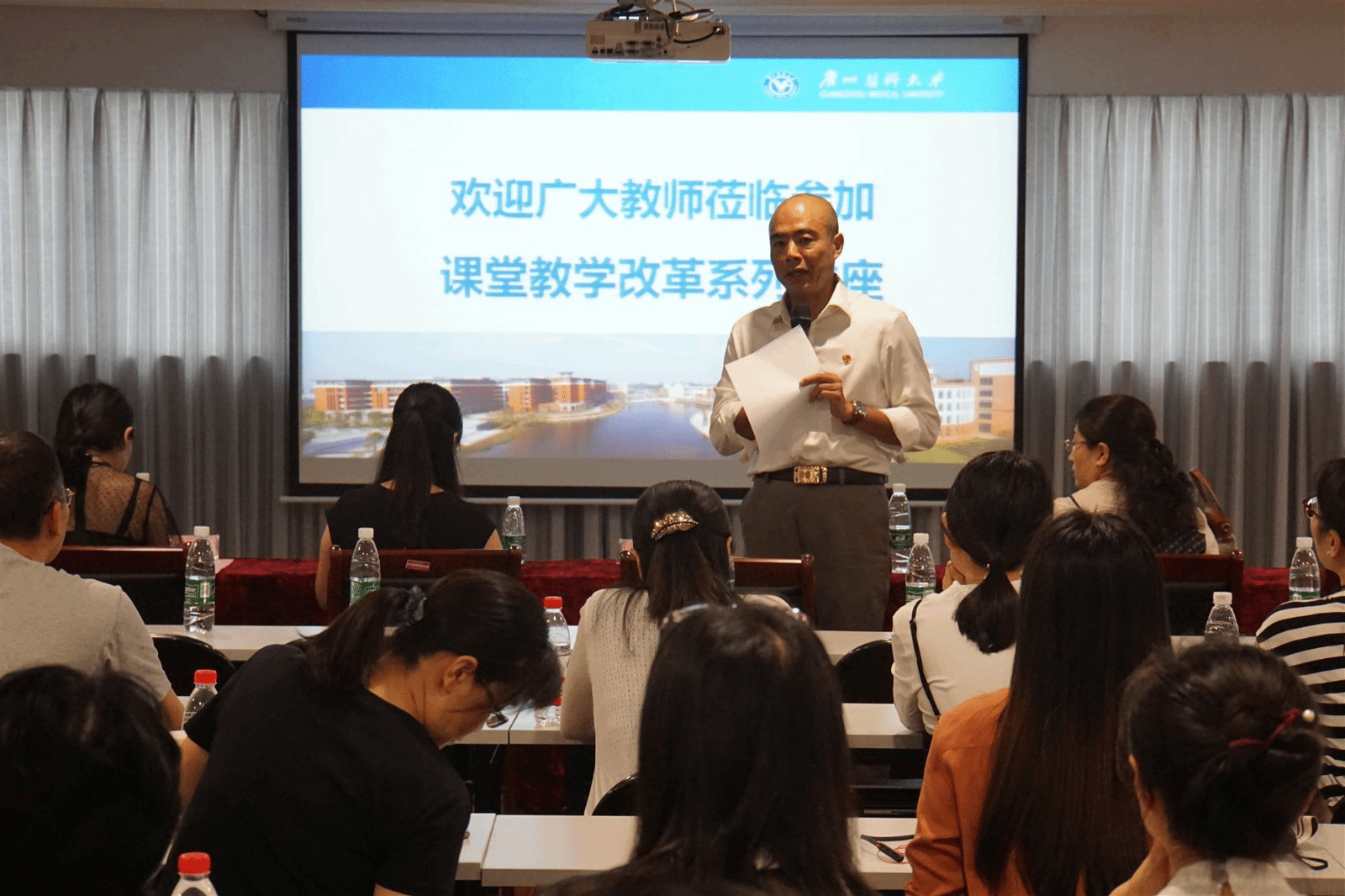 2019年9月27日下午,第二场课堂教学改革系列讲座面向第一临床学院、护理学院、金域检验学院教师于越秀校区10栋1306会议室顺利举办。本次讲座主题为“课程思政与课堂教学改革”,第一临床学院、护理学院、金域检验学院的教学副院长、专业负责人、教研室主任、教学秘书、中青年骨干教师等60余名教师参加本次讲座,护理学院徐学虎副院长主持了本次活动。