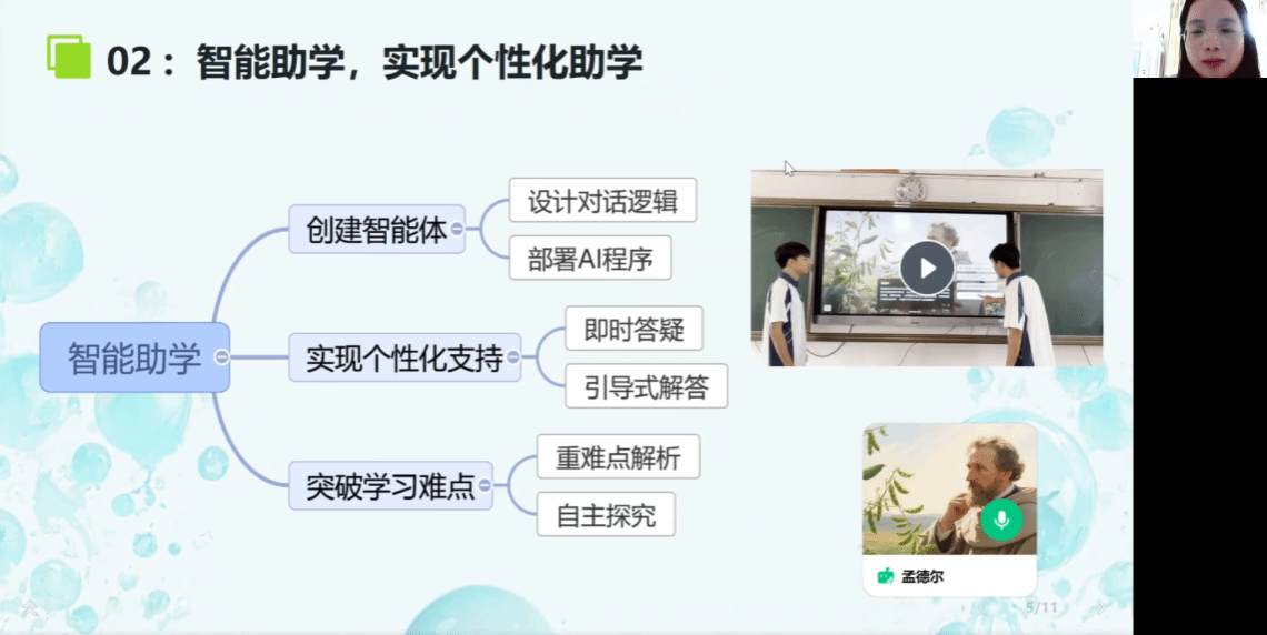 首先,由两位参训的优秀教师代表就培训成果与经验展开分享与交流。来自连山小三江初级中学梁丽莲老师认为,通过参加培训,自身实现了从“工具应用”到”思维革新”的跨越,掌握了面向未来的三大关键能力,即AI协同力、资源创造力和技术整合力,并分享了AI技术在课堂教学中的具体实践应用。随后,连山中学的周健桃老师以“技术赋能 遇见未来”为主题,分享了AI如何重构备课流程、实现个性化支持和激活课堂教学。周老师展示了利用希沃白板的AI备课功能制作生动的生物课件,同时创建了AI智能体“孟德尔科学探究助手”以帮助学生开展课后学习活动。她表示本次培训内容丰富且实用,通过培训大家看到了技术赋能下教育的广阔前景,并得到了教育本质不会改变,教育的方式可以持续创新的启示。